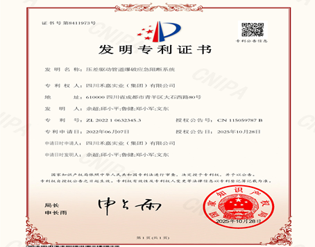 四川禾嘉一項具有原始創新非能動智能控制技術的 “壓差驅動管道爆破應急阻斷系統”獲得中國發明專利
